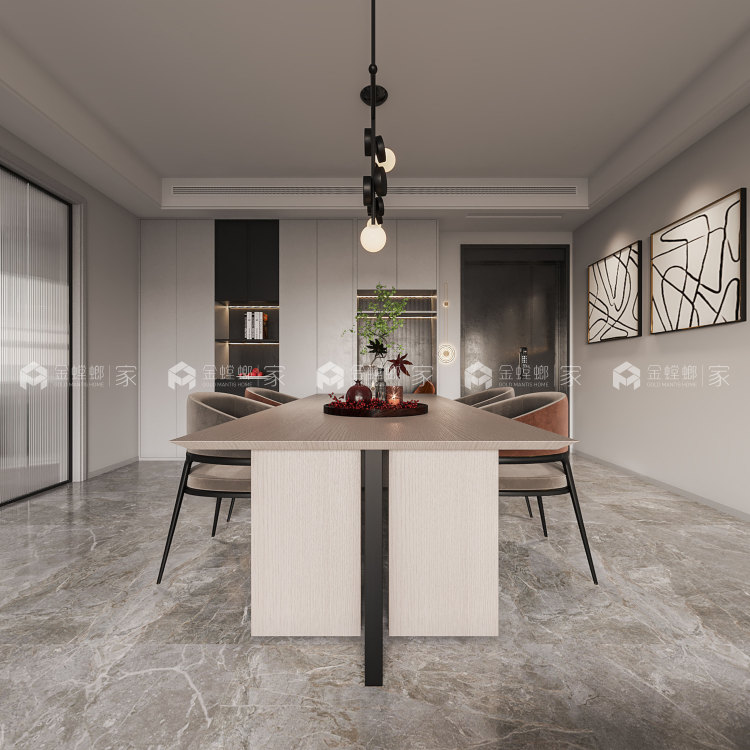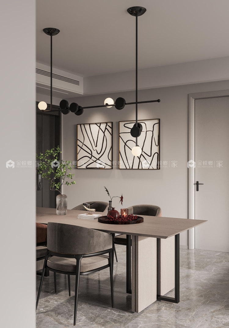 餐厅造型独特的吊灯为空间带来艺术美感,整体选用灰色与木色作为主色调,高级有格调。